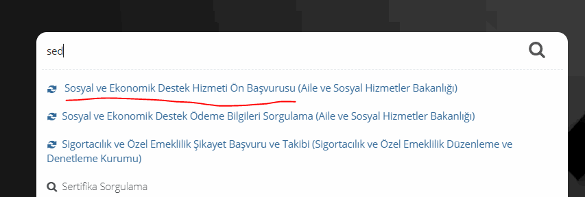 E devlet kapısı üzerinden başvurular alınıyor. Başvuru yapmak isteyenlerin turkiye.gov.tr adresi üzerinden aşağıdaki gibi arama kısmına SED yazması gerekmektedir.