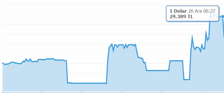Gelen son dakika bilgilerine göre dolar kuru 26 Aralık 2023 tarihinde rekor tazeleyerek 29 lira 38 kuruş seviyesine çıktı. Sert yükselişin ardından dolar kuru 29 lira 31 kuruş seviyesine geriledi. İşte dolar kurunda yaşanan hareketlilik: