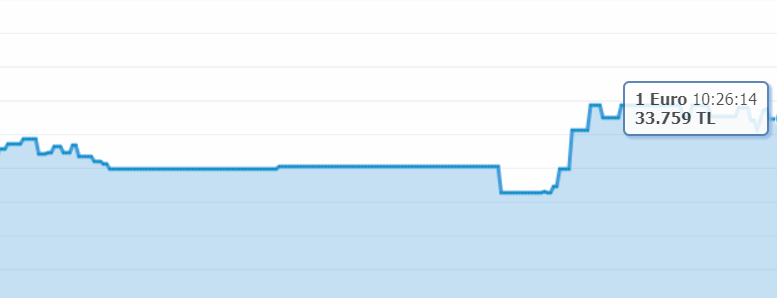 Dolar kuru ile birlikte Euro kurunda da yükseliş görüldü. Yaşanan yükseliş ile birlikte 1 Euro 34 liraya yaklaştı ve şimdi 33 lira 75 kuruş seviyesinden seyrediyor: İşte euro kurunda yaşanan yükselişin grafiği: