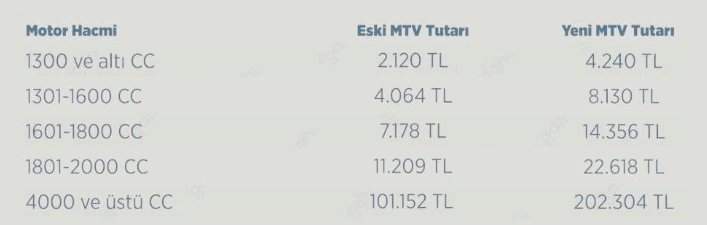 Araç sahiplerinin ödemeleri gereken ek MTV tutarları şu şekilde;
