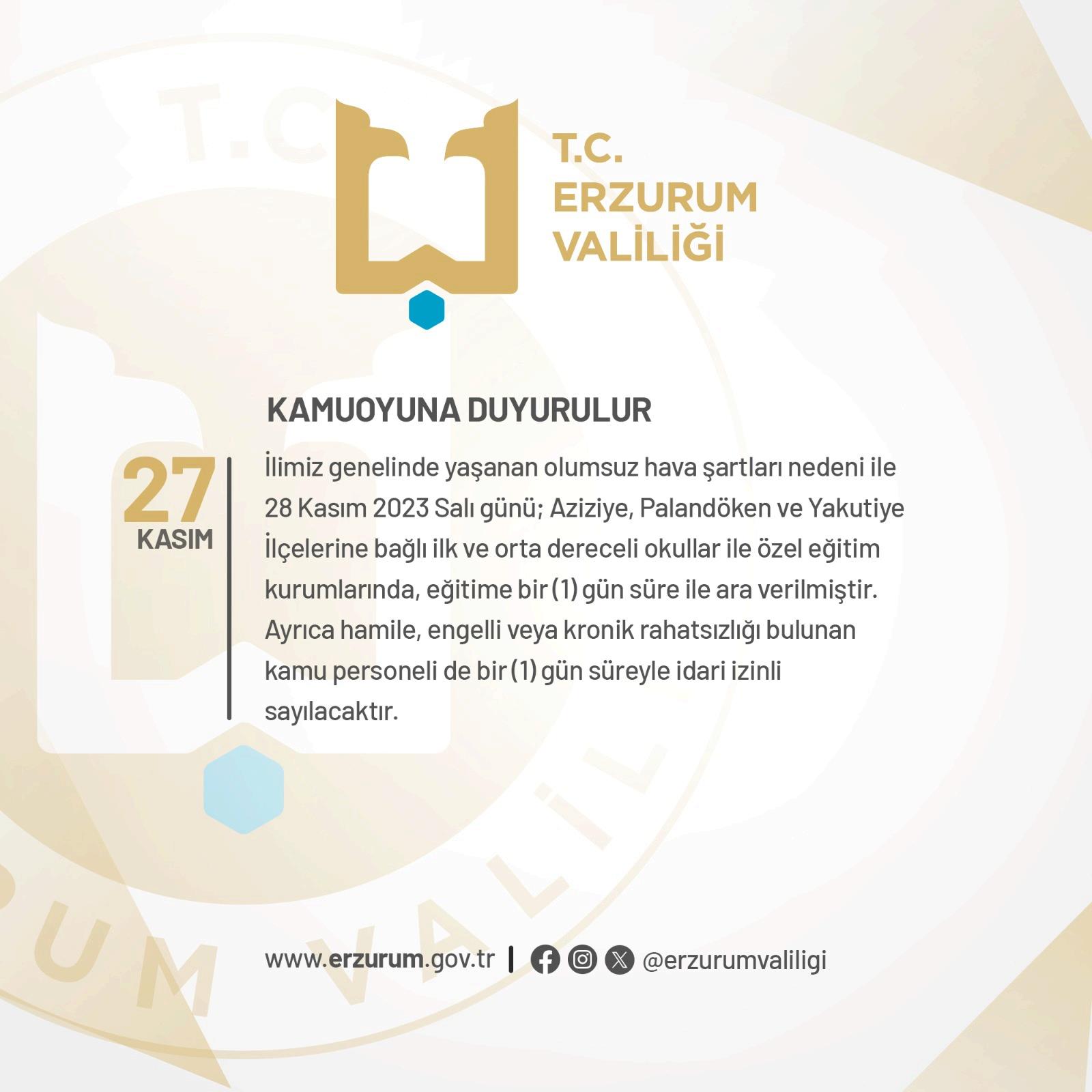 İlimiz genelinde yaşanan olumsuz hava şartları nedeni ile 28 Kasım 2023 Salı günü aziziye Palandöken ve Yakutiye ilçelerine bağlı ilk ve orta dereceli okullar ile özel eğitim kurumlarında, eğitime bir gün süre ile ara verilmiştir. Ayrıca hamile, engelli veya kronik rahatsızlığı bulunan kamu personeli de bir gün süreyle idari izinli sayılacaktır.