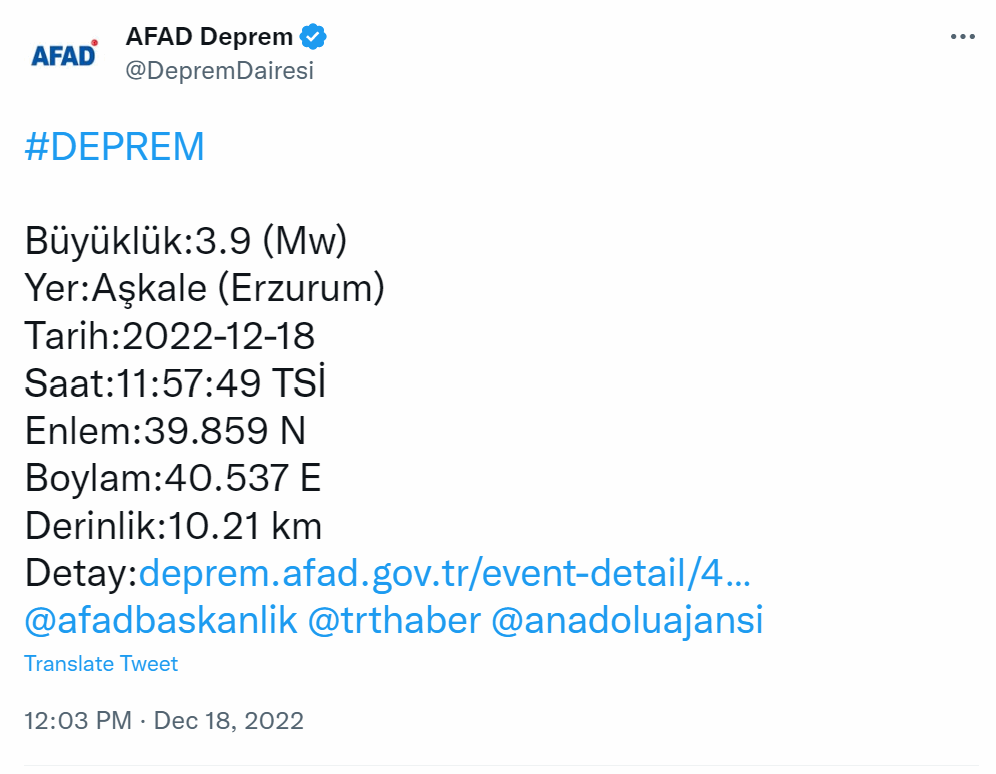AFAD'ın aktardığı verilere göre saat 11:57'de Erzurum-Aşkale merkez üslü bir deprem meydana geldi.