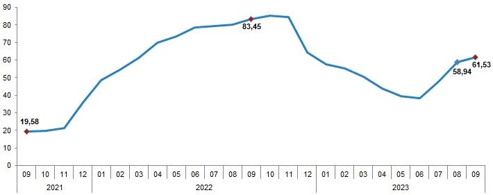 TÜFE'deki (2003=100) değişim 2023 yılı Eylül ayında bir önceki aya göre %4,75, bir önceki yılın Aralık ayına göre %49,86, bir önceki yılın aynı ayına göre %61,53 ve on iki aylık ortalamalara göre %55,30 olarak gerçekleşti.