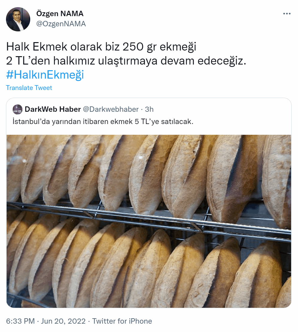 Özgen Nama, sosyal medya hesabında bugün yaptığı paylaşımda, "Biz, 250 gr ekmeği 2 TL'den halkımıza ulaştırmaya devam edeceğiz' dedi.