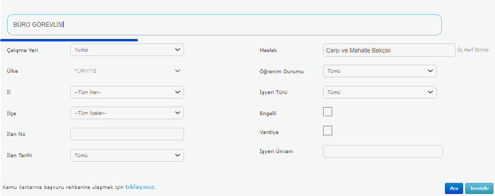 Yukarıdaki gibi aradığınız pozisyon yazan kısmına , başvuru yapmak istediğiniz kadroyu yazın ve ARA butonuna tıklayın. İlanlar aşağıda sıralanacaktır. Kadın erkek memurlar bu sayfada >>> TIKLA TAKİP ET