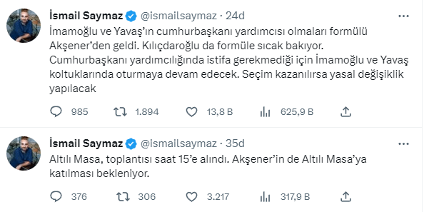 "İmamoğlu ve Yavaş'ın cumhurbaşkanı yardımcısı olmaları formülü Akşener'den geldi. Kılıçdaroğlu da formüle sıcak bakıyor. Cumhurbaşkanı yardımcılığında istifa gerekmediği için İmamoğlu ve Yavaş koltuklarında oturmaya devam edecek. Seçim kazanılırsa yasal değişiklik yapılacak"