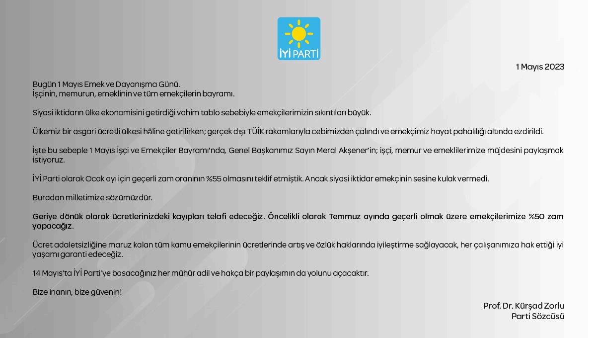 Son dakika haberi geldi. Gelen haberde İYİ Parti, Temmuz ayında memurlar, işçiler ve emeklilere yüzde 50 oranında zam yapacaklarını ilan etti. İYİ Parti Sözcüsü Prof. Dr. Kürşad Zorlu yaptığı son dakika açıklamasında şu ifadeleri kullandı: