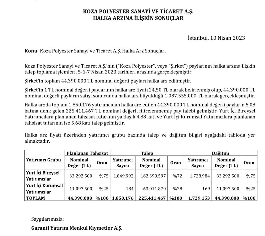 Koza Polyester Sanayi ve Ticaret AŞ'nin ("Koza Polyester", veya "Şirket") paylarının halka arzına ilişkin talep toplama işlemleri 5-6-7- Nisan 2023 tarihleri arasında gerçekleşmiştir.