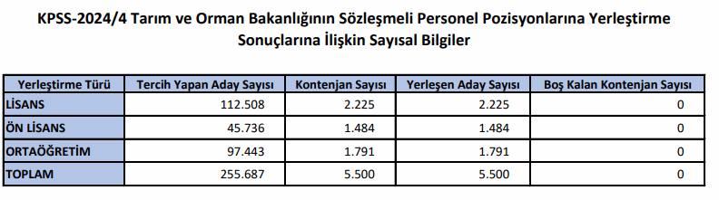 31 Ocak-7 Şubat 2024 tarihleri arasında tercihleri alınan KPSS-2024/4 Tarım ve Orman Bakanlığının sözleşmeli personel pozisyonlarına yerleştirme işlemleri tamamlanmıştır.