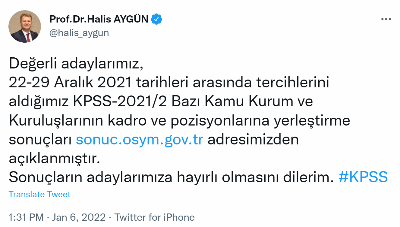 ÖSYM Başkanı Halis Aygün, sosyal medya paylaşımında, sonuçların adaylara hayırlı olmasını diledi.