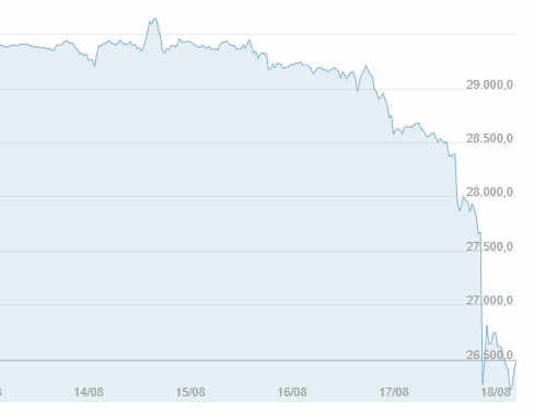 Kripto para piyasasından gelen son dakika bilgilerine göre 1 BTC fiyatı 26 bin 443 dolar seviyesinde işlem görüyor. İşte Bitcoin grafiğinde yaşanan düşüşün grafiği: