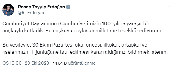 Cumhurbaşkanı ve AK Parti Genel Başkanı Recep Tayyip Erdoğan bir son dakika açıklamasında bulundu ve 29 Ekim Cumhuriyet Bayramı vesilesi ile okulların 1 günlüğüne tatil edildiğini duyurdu.