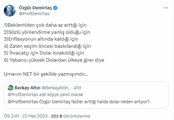 Ünlü Ekonomist Özgür Demirtaş sosyal medya hesabı üzerinden gelen "@ProfDemirtas Özgür Demirtaş faizler arttığı halde dolar neden artıyor?" sorusuna şu yanıtı verdi;
