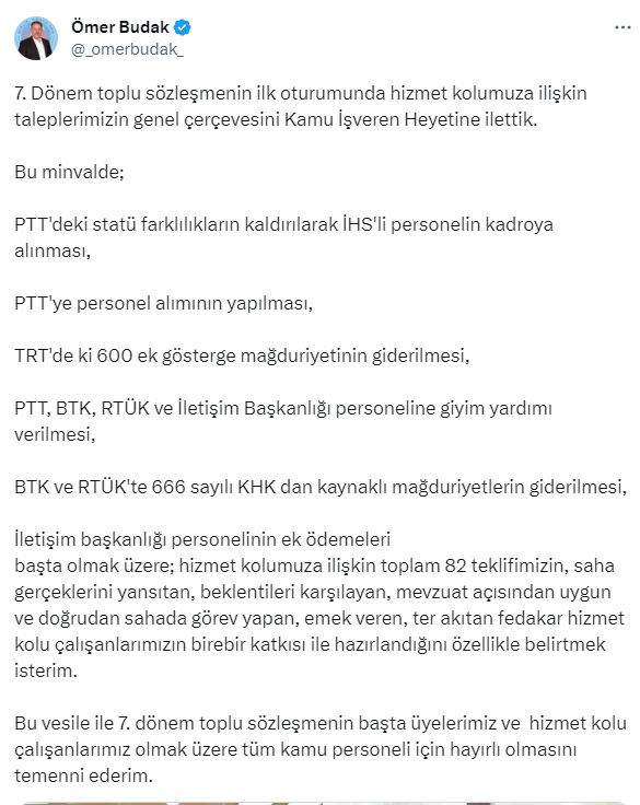 Bu vesile ile 7. dönem toplu sözleşmenin başta üyelerimiz ve hizmet kolu çalışanlarımız olmak üzere tüm kamu personeli için hayırlı olmasını temenni ederim"