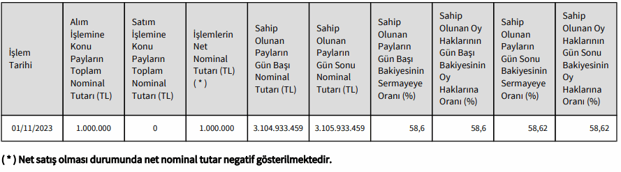 işlemle birlikte SASA POLYESTER SANAYİ A.Ş. sermayesindeki paylarım/oy haklarım 01/11/2023 tarihi itibariyle %58,62 sınırına