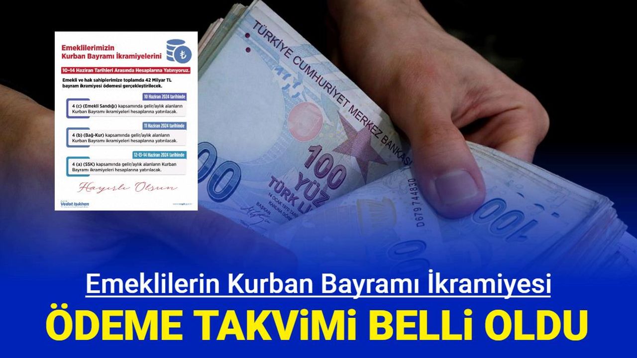 Cumhurbaşkanı Recep Tayyip Erdoğan'ın kabine sonrası yaptığı açıklamasından sonra takvim de belli oldu. Çalışma ve Sosyal Güvenlik Bakanı Vedat Işıkhan yaptığı açıklamada emeklilerin Kurban Bayramı ikramiye ödemesine ilişkin takvimi şu şekilde aktardı: