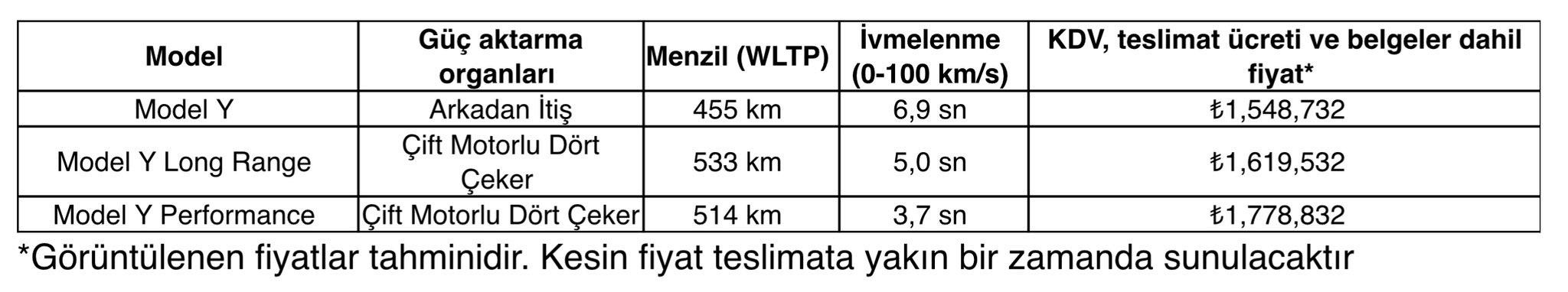 Model Y Performance Çift motorlu dört çeker aracın menzili 514 km. 0'dan 100'e 3.7 saniyede çıkan aracın fiyatı 1 milyon 778 bin 832 lira.