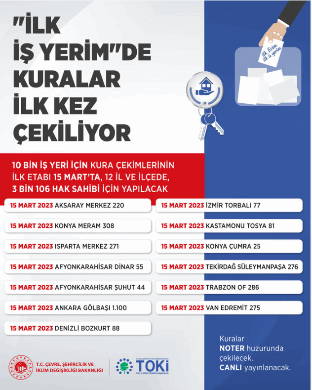 Sosyal medya hesabı üzerinden bir açıklama yapan Bakan Kurum, sosyal medya hesabı üzerinden yaptığı açıklamada ilk iş yerim projesi kapsamında 10 bin iş yeri için kura çekimlerinin başlandığını bildirdi. Bakan yaptığı açıklamada, "250 alt sektörü harekete geçiren 'İlk Evim, İlk İş Yerim' projemizle istihdamı destekliyor, vatandaşımızı iş sahibi de yapıyoruz. Konut ve arsa kuralarımız devam ederken sıra iş yerlerine geldi. 12 ilde, 3 bin 106 iş yeri için 15 Mart'ta kuraları çekmeye başlıyoruz" ifadelerini kullandı.