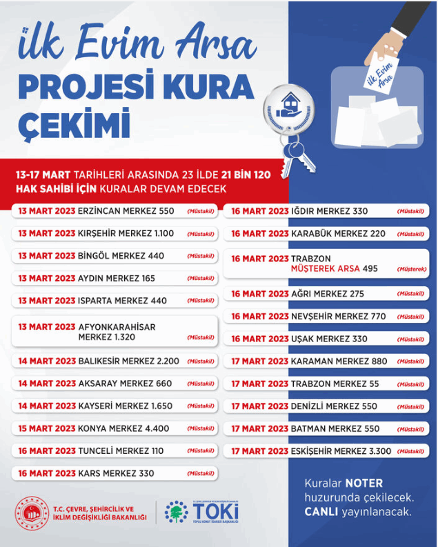 Yeni duyuruda arsada yeni kuraların 13 ile 17 Mart 2023 tarihleri arasında yapılacağı bildirilirken 23 ilde 21 bin 120 hak sahibinin belirleneceği bildirildi.