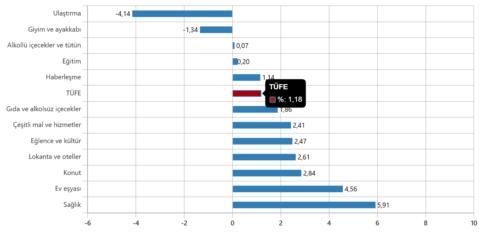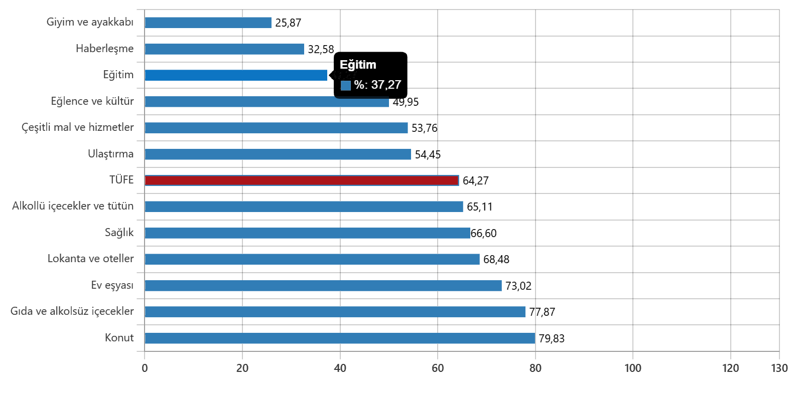 Bir önceki yılın aynı ayına göre en az artış gösteren ana grup %25,87 ile giyim ve ayakkabı oldu. Buna karşılık, bir önceki yılın aynı ayına göre artışın en yüksek olduğu ana grup ise %79,83 ile konut oldu.