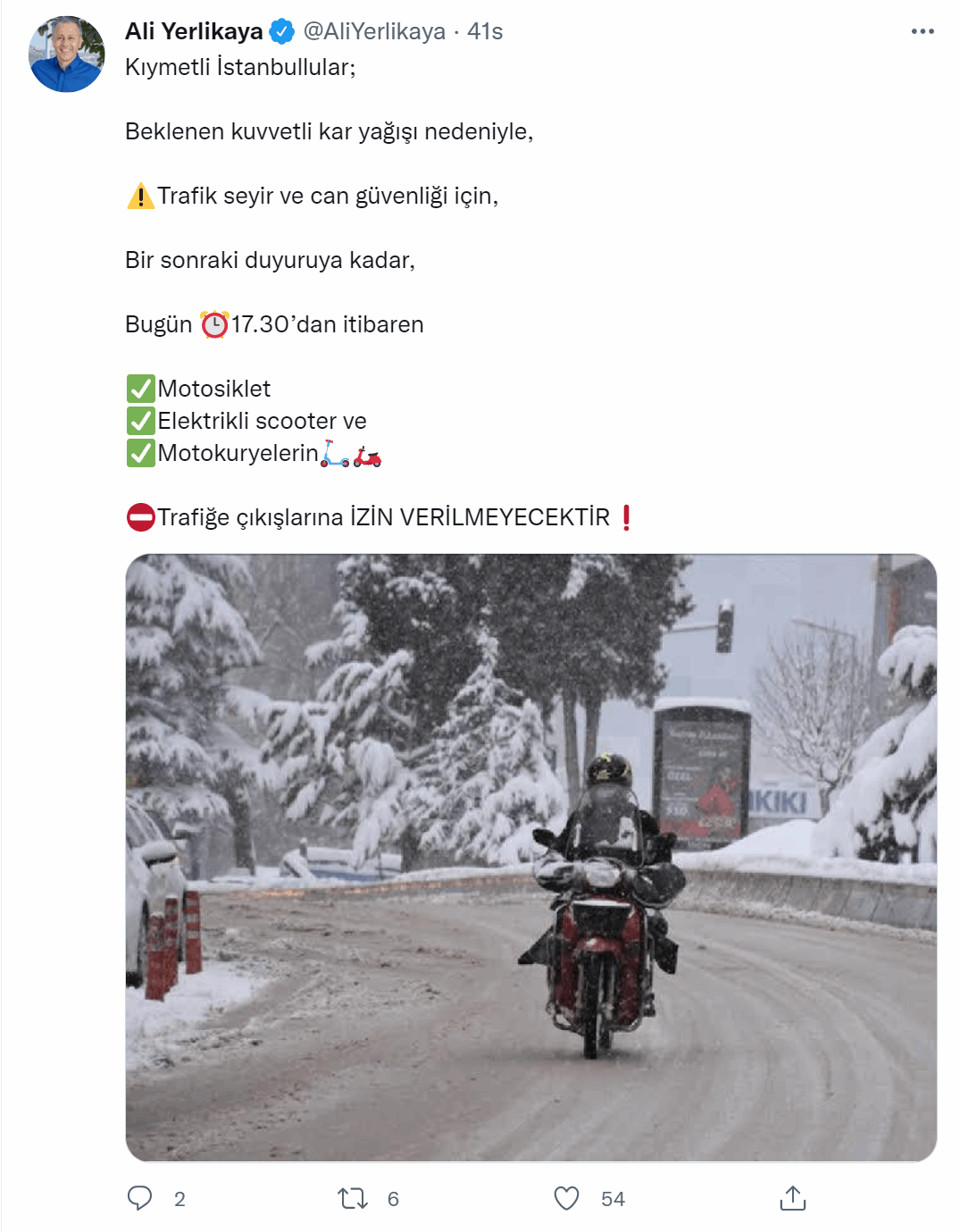 Yerlikaya tweetinde: Meteoroloji Bölge Müdürlüğü'nün son verilerine göre #İstanbul'da BUGÜN: 18.00-24.00 arası KUVVETLİ KAR SAĞANAKLARI bekleniyor