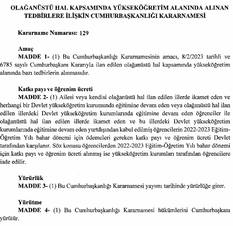 "Ailesi veya kendisi olağanüstü hal ilan edilen illerde ikamet eden ve herhangi bir devlet yükseköğretim kurumunda eğitimine devam eden veya olağanüstü hal ilan edilen illerdeki devlet yükseköğretim kurumlarında eğitimine devam eden öğrenciler ile olağanüstü hal ilan edilen illerde ikamet eden ve bu illerdeki devlet yükseköğretim kurumlarında eğitimine devam eden yurtdışından kabul edilmiş öğrencilerin 2022 2023 eğitim öğretim yılı bahar dönemi için ödemeleri gereken katkı payı ve öğrenim ücreti devlet tarafından karşılanır. Söz konusu öğrencilerden 2022 2023 eğitim öğretim yılı bahar dönemi için katkı payı ve öğrenim ücreti alınmış ise yükseköğretim kurumları tarafından öğrencilere iade edilir"