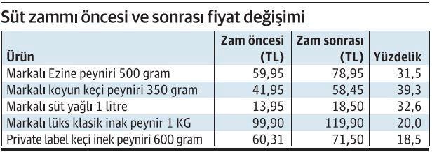 Süt zammından önceki ve sonraki fiyatlar ve değişimler şu şekilde: