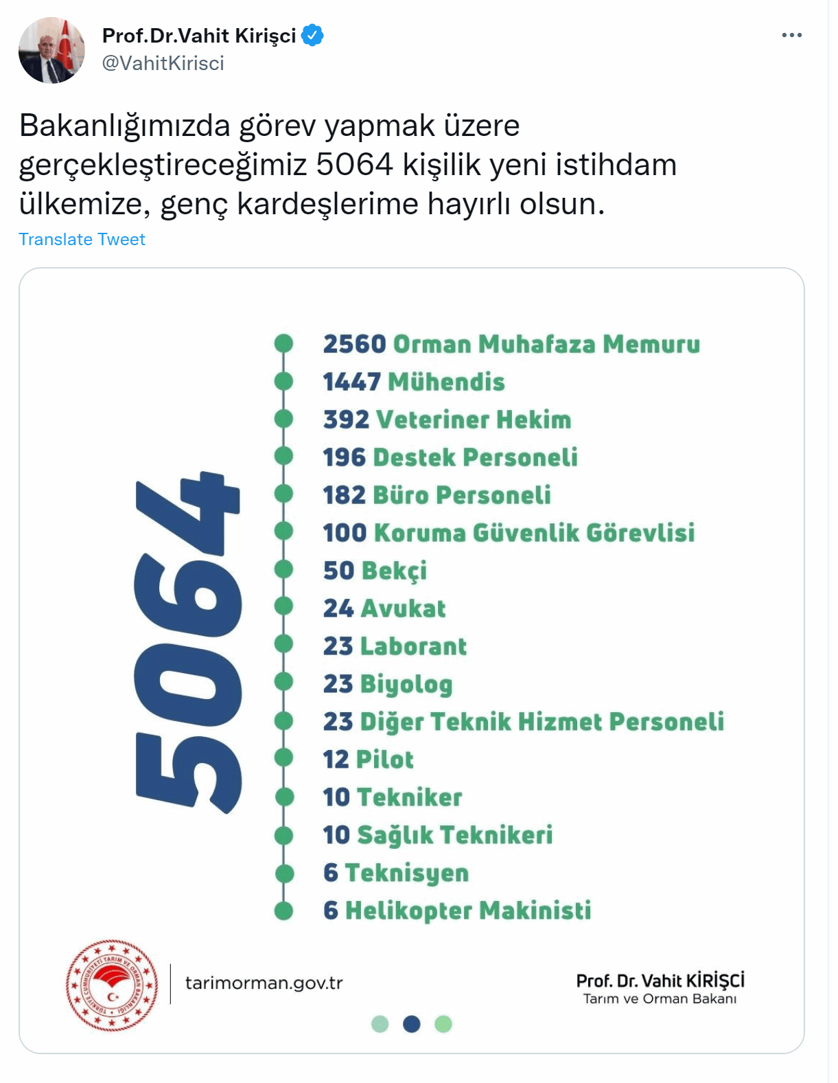 Tarım ve Orman Bakanı Vahit Kirişci 5 Bin 64 kadro dağılımının nasıl olduğunu Twitter hesabı üzerinden açıkladı.
