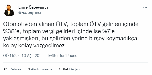 Sosyal medya hesabı üzerinden açıklama yapan Özpeynirci, son günlerdeki ÖTV düzenlemesine değindi ve otomobilde alınan ÖTV'nin , toplam ÖTV gelirlerinin yüzde 38'i kadar olduğunu, tüm vergilerin ise yüzde 7'sine denk geldiğine yer verildi.