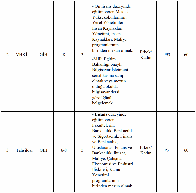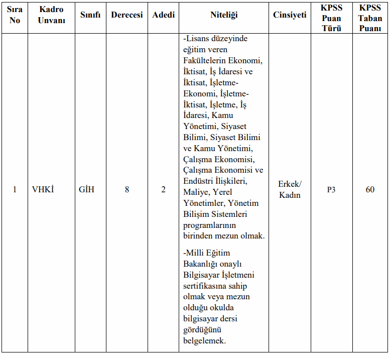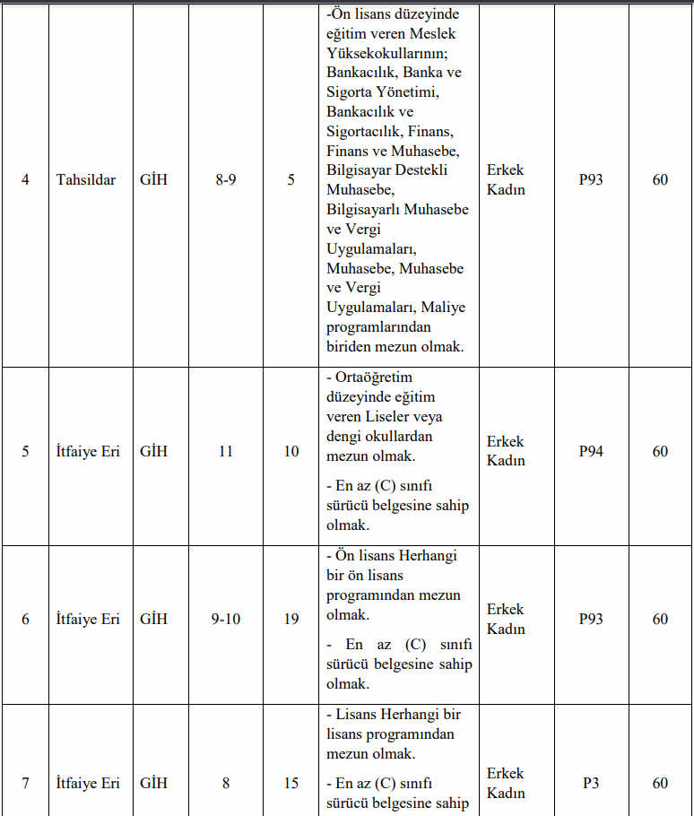 Yayınlanan duyuruya baktığımızda alınacak adayların Veri Hazırlama ve Kontrol İşletmeni, Tahsildar, İtfaiye Eri akdrolarında istihdam edileceği görüldü. KPSS 60 puan şartı ile yapılacak personel alımının başvurusuna dair bilgiler şu şekilde: