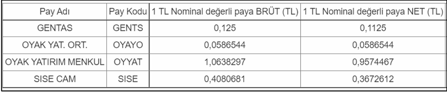 GENTS kodu ile borsada işlem görmekte olan Gentaş hissesi yatırımcısına 1 TL nominal değerli paya 0.1125 TL'lik net para ödemesi yapacak.