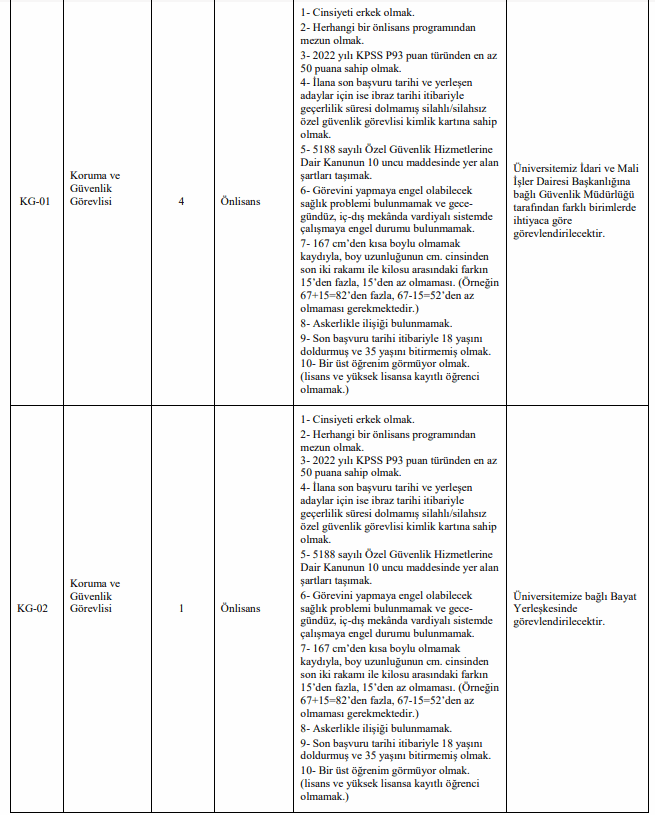 12- Koruma ve Güvenlik Görevlisi pozisyonuna başvurarak atanmaya hak kazanan adayların kamu veya özel sağlık kuruluşunda boy ve kilo ölçümü yaptırarak belgelendirmesi gerekmektedir.