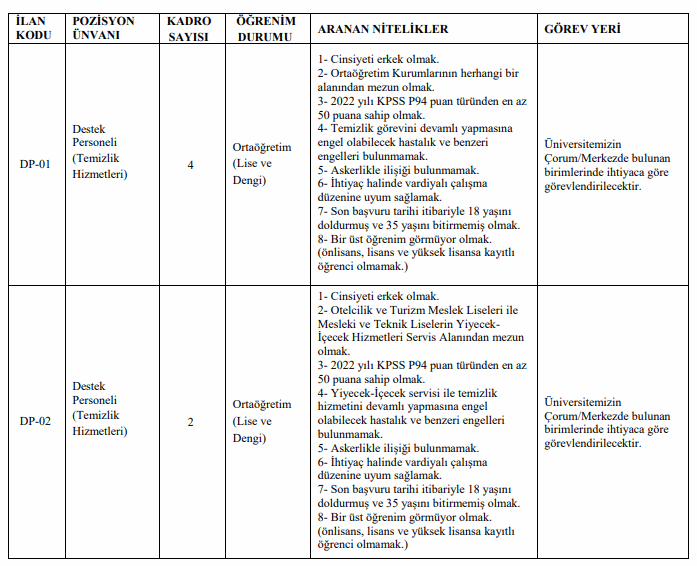 İlana başvurular 8 Mayıs ile 22 Mayıs tarihleri arasında Hitit Üniversitesi Personel Dairesi Başkanlığı'na şahsen yapılacaktır. İlan metni için TIKLAYIN
