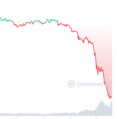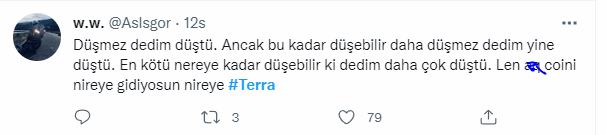 Bugüne 340 lira seviyesinden başlayan Terra Luna, kısa süre içinde hızlı şekilde düşmeye başladı. Grafiğe baktığımızda yaşanan dikey düşüş dikkatleri çekti. Düşüş oranı bir gün içinde yüzde 95'e geldi. Yaşanan bu düşüşle Terra Luna yüzde 94 değer kaybetti ve 16 lira 50 kuruşa kadar düştü. İşte grafikte yaşanan düşüşün grafiği: