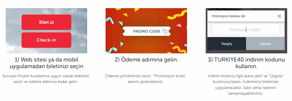 %40 indirimin uygulanabilmesi için Türk Hava Yolları web sitesi ve mobil uygulaması üzerinden uçuş seçilip ödeme aşamasına gelindiğinde TURKIYE40 indirim kodu girilmelidir.