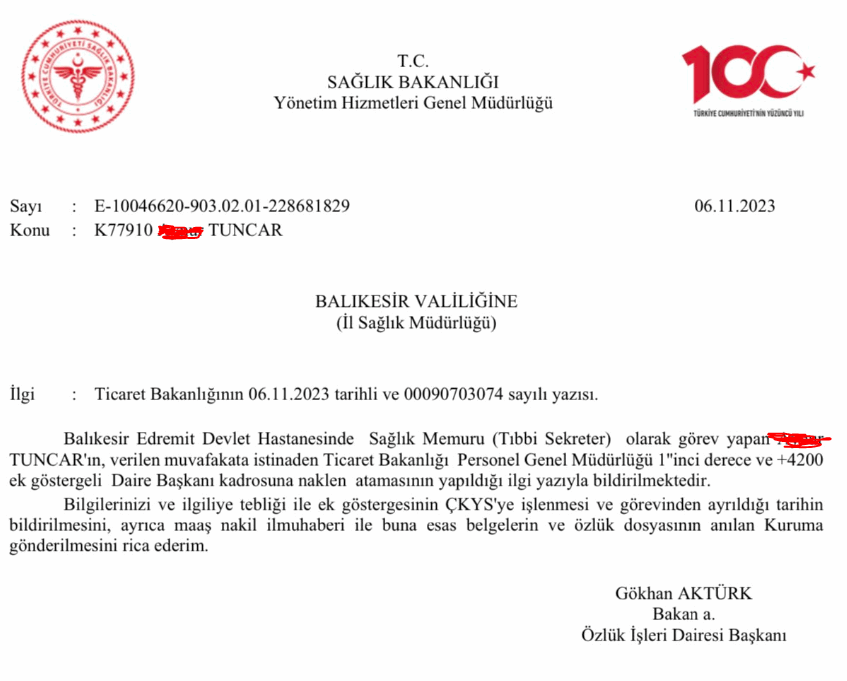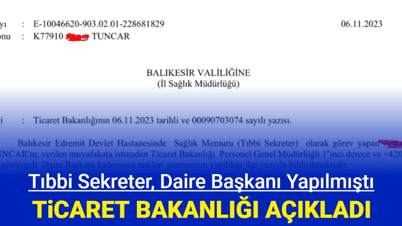 Ticaret Bakanlığı'na gönderilen bir yazı sosyal medyaya düşmüş ve kısa sürede gündem olmuştu. Söz konusu yazıda bir tıbbi sekreterin daire başkanı görevine atandığı ve zimmete düşme işleminin yapılması gerektiğine yer verilmişti.
