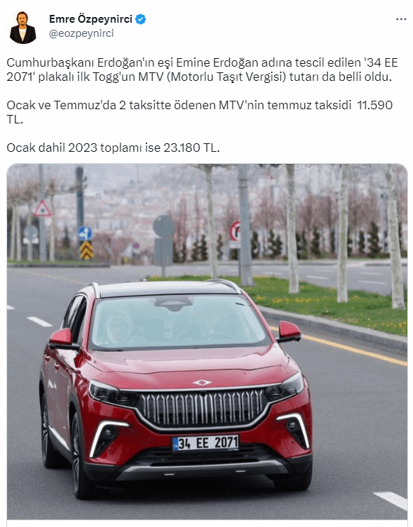 "Cumhurbaşkanı Erdoğan'ın eşi Emine Erdoğan adına tescil edilen '34 EE 2071' plakalı ilk Togg'un MTV (Motorlu Taşıt Vergisi) tutarı da belli oldu.