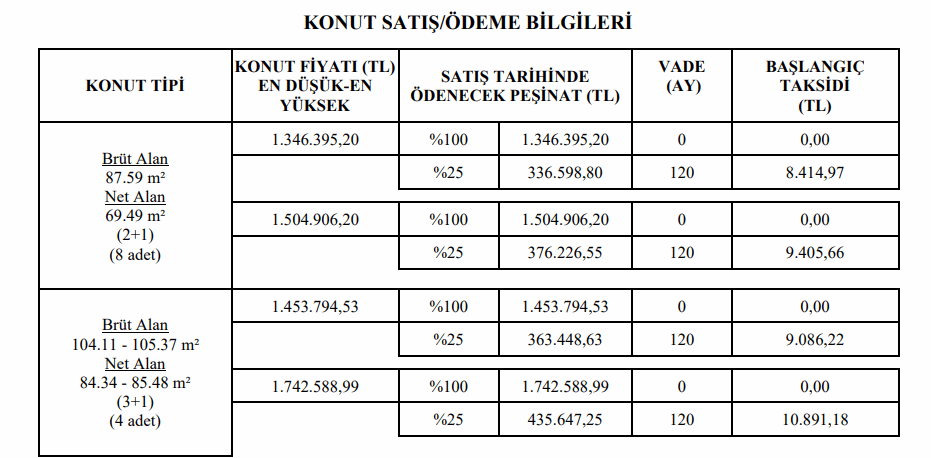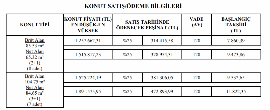 TOKİ resmi sayfasından yayınlanan duyuruda, Denizli'de 2+1 ve 3+1 konut satışı yapılacağına ve aylık takstilerin 7 bin 776 TL'den başlayacağına yer verildi. İşte konut ödeme tablosu: