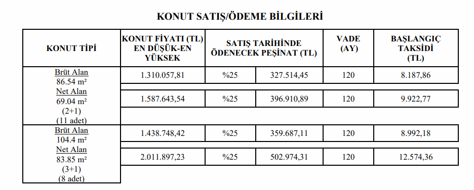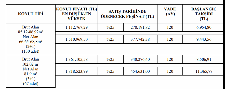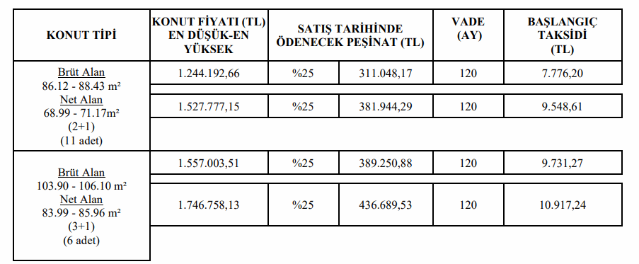 TOKİ resmi sayfasından yayınlanan duyuruda, Ankara'da 2+1 ve 3+1 konut satışı yapılacağına ve aylık takstilerin 6 bin 954 TL'den başlayacağına yer verildi. İşte konut ödeme tablosu: