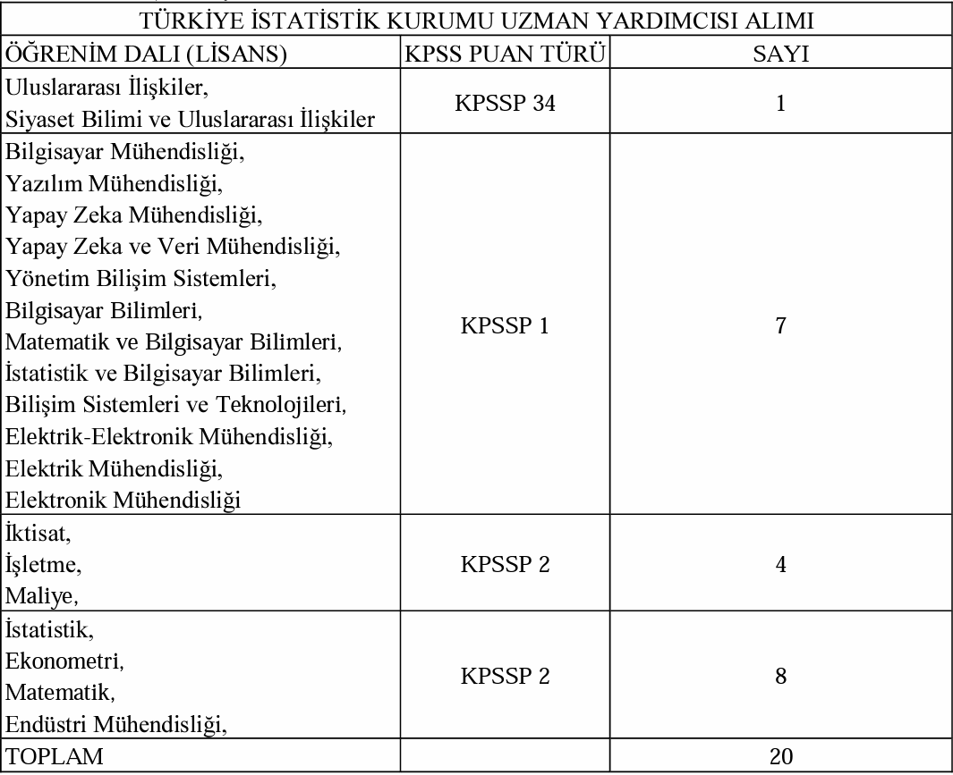 TÜİK tarafından yayınlanan son dakika açıklamasında uzman yardımcısı kadrosunda çalıştırmak üzere 20 kamu personeli alımı yapılacağına yer verildi.