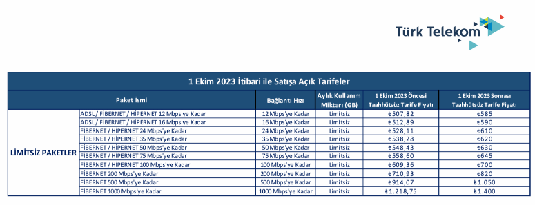 Türkiye'deki en büyük internet sağlayıcılarından oaln TT, son dönemlerde yaşanan yüksek nflasyonla birlikte artan maliyetleri sebep göstererek tarifelere zam yapacağını duyurdu. İlk olarak Eylül ayının başında TT tarafından yayınlanan fiyatlar, 1 Ekim 2023 tarihinden sonra geçerli olacak.