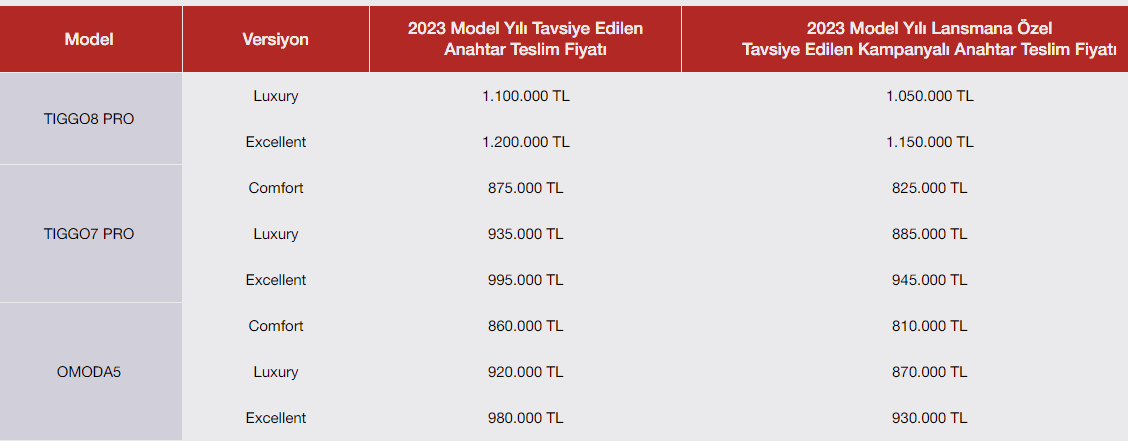 Chery fiyat listesi şu şekilde: