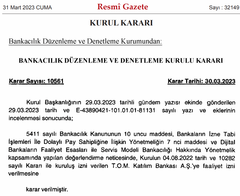 5411 sayılı bankacılık kanunun 10 uncu maddesi bankaların izne tabi işlemleri ile dolaylı pay sahipliğine ilişkin yönetmeliğin 7 nci maddesi ve dijital bankaların faaliyet esasları ile servis modeli bankacılığı hakkında yönetmelik kapsamında yapılan değerlendirme neticesinde, kurulun 04.08.2022 tarih ve 10282 sayılı Kararı ile kuruluş izni verilen T.O.M. Katılım Bankası A.Ş.'ye faaliyet izni verilmesine karar verilmiştir.