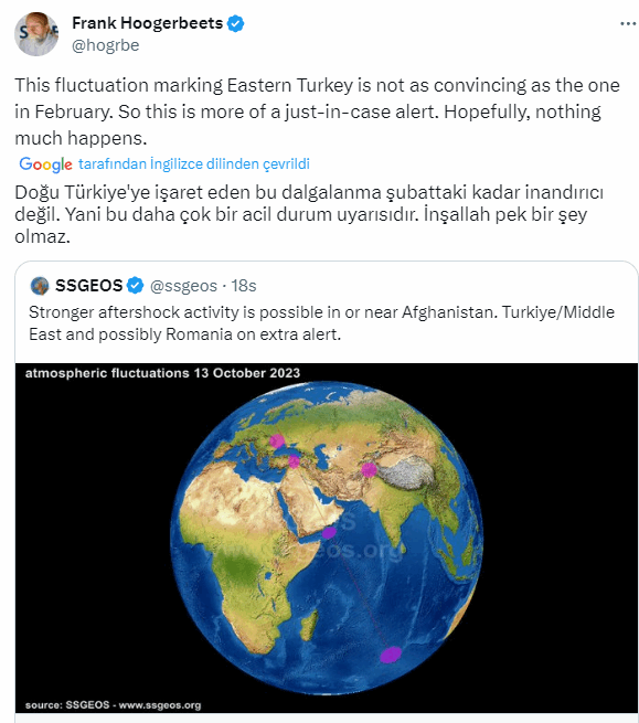 Sosyal medya hesabı üzerinden açıklama yapan Hoogerbeets, Afganistan'da daha güçlü artçı depremler olmasının mümkün olduğunu söyledi ve Türkiye hakkında şu uyarıları yaptı: