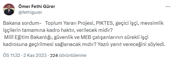 Açıklamasına taşerona kadro konusu ile başlayan Gürer, "Taşeronu da bir açıklayın da çok bekleyen var.'-'Taşeron konusunda hiçbir şey yok mu?Sunumuzda yoktu,şimdi yok.Taşeronda kalanlara sözünüz var,kadro vermeyecekmisiniz?Bu binlerce insanı ilgilendiren bir konu.'Bakan,#Taşeron hiç konuşmadı.Yazılı yanıt verecek" sorusunu sordu.