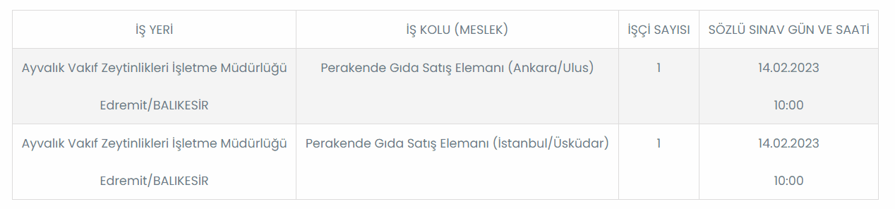 Vakıflar Genel Müdürlüğü Ayvalık Vakıf Zeytinlikleri İşletme Müdürlüğüne bağlı satış şubelerinde olmak üzere Parakende Gıda Satış Elemanı alımı yapacak olup kontenjan dağılımı şu şekilde;