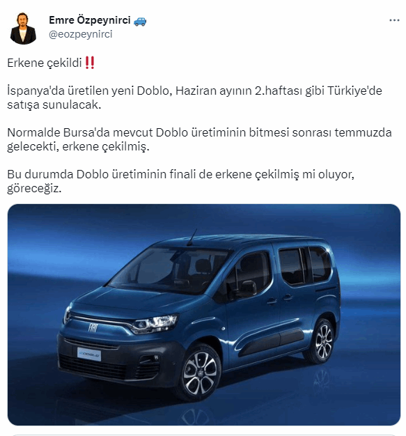 Gazeteci Emre Özpeynirci konu ile ilgili bir açıklama yaptı. Özpeynirci yaptığı açıklamada "Bursalı Doblo gidiyor İspanyol geliyor" demiş ve "Tofaş, temmuzdan itibaren Bursa'da Doblo üretimini bitirip, 5 marka için üreteceği yeni orta sınıf ticari araç çalışmalarına başlayacak" demişti. 12 Nisan tarihinde yaptığı bu açıklamasını alıntılayan Özpeynirci, Türkiye'ye gelişin erkene çekildiğini söyledi.
