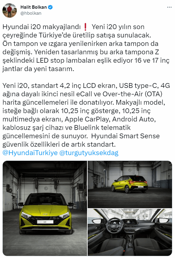 Gazeteci Halit Bolkan yaptığı açıklamada yeni makyajlı i20'nin 2023 yılı son çeyreğinde Türkiye'de üretileceğini ve satışının son çeyrekte başlayacağına yer verildi.