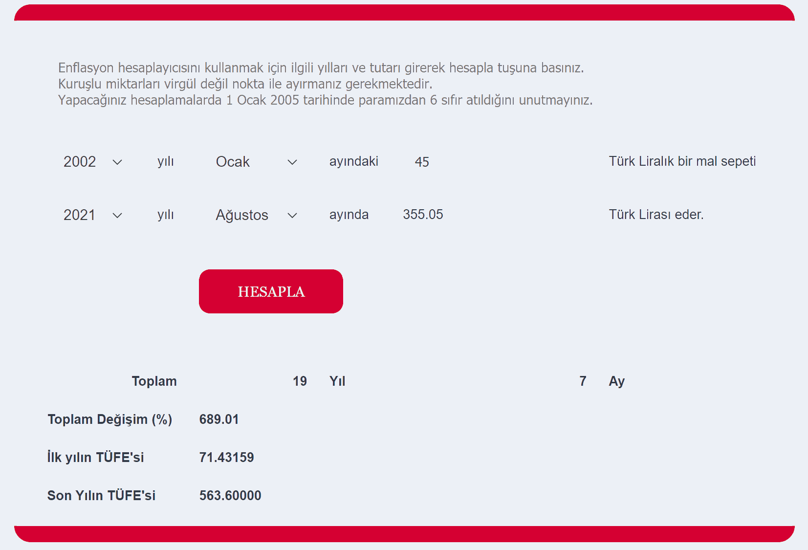 Merkez Bankası “Enflasyon Hesaplayıcısı” üzerinden yapılan hesaplaya göre 2002 yılındaki 45 TL bugün 355 TL ediyor.