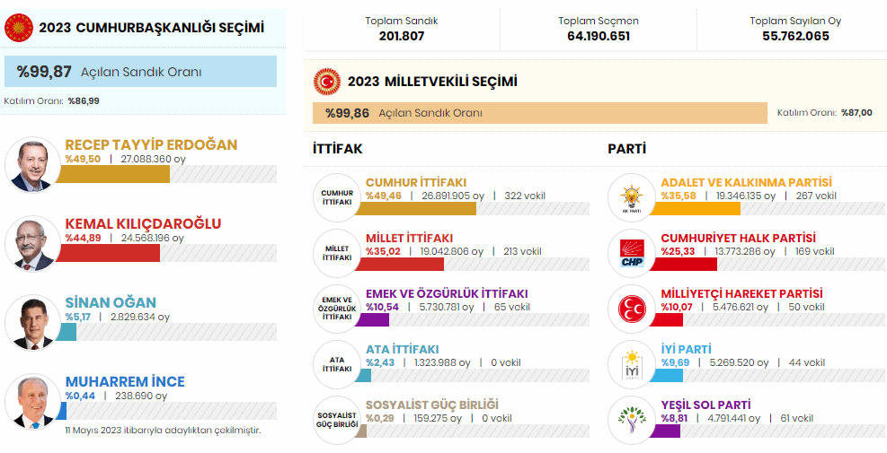 Yükske Seçim Kurulu tarafından bir son dakika açıklaması yapıldı. Yapılan açıklamada seçimlerin 2. tura kaldığı ve 2. tur seçimlerinin 28 Mayıs 2023 -Pazar günü yapılacağını bildirdi.
